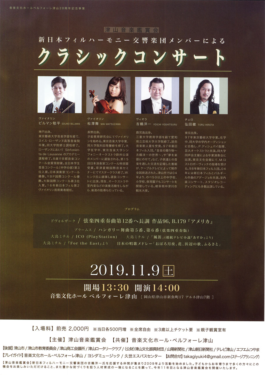 このコンサートは、新日本フィルハーモニー音響楽団の吉鶴洋一氏を応援する津山の仲間が集まり2009年から開催しているもので、今回で11回目を迎えます。
