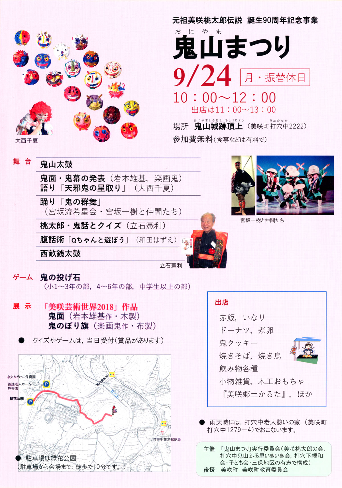 桃太郎3大伝説地(総社市・高松市・犬山市)に、新しく加わった美咲町の桃太郎、この文献上最古の伝説地で、9月24日(月)誕生90周年を記念した「鬼山まつり」が行われた。